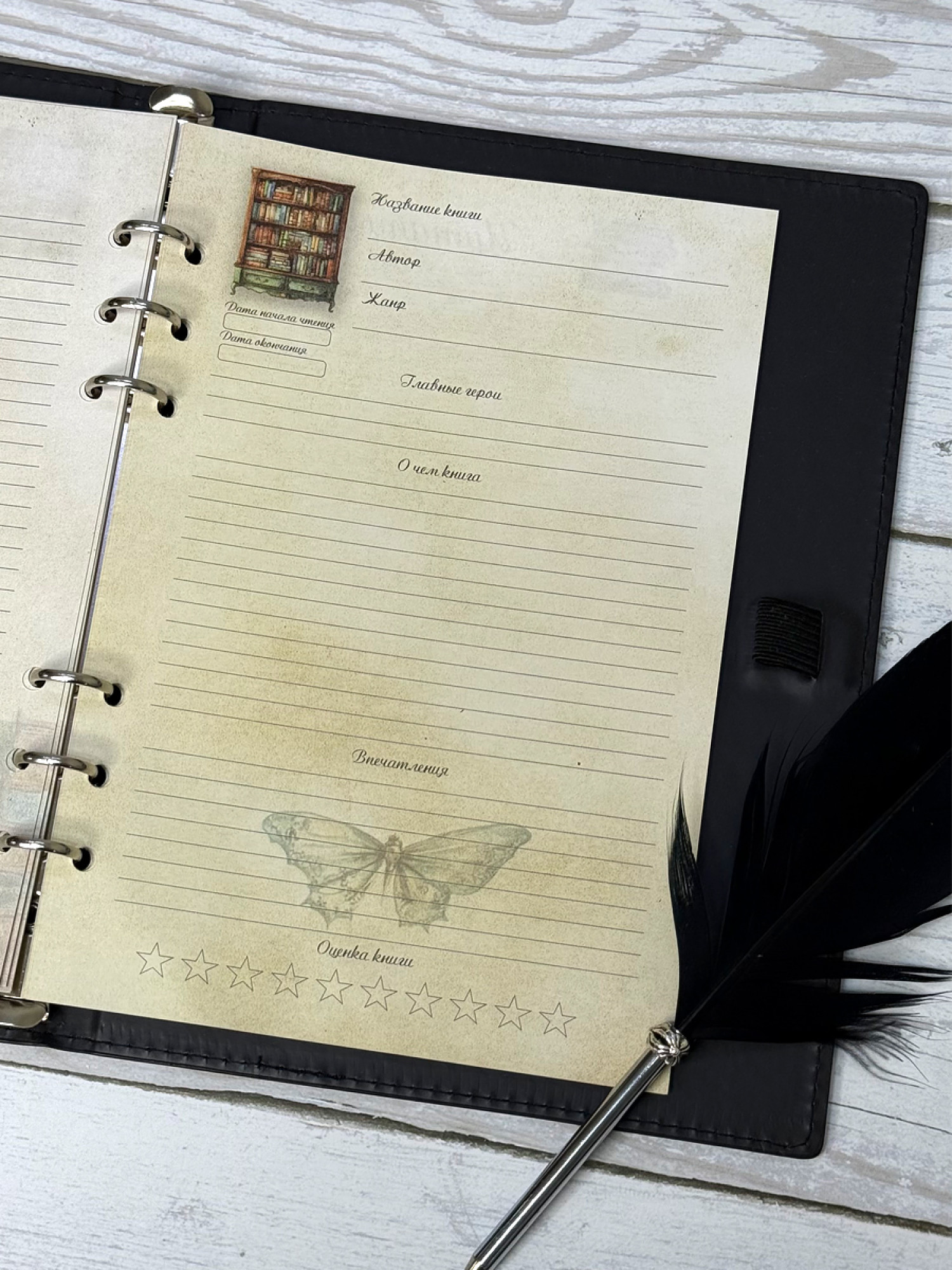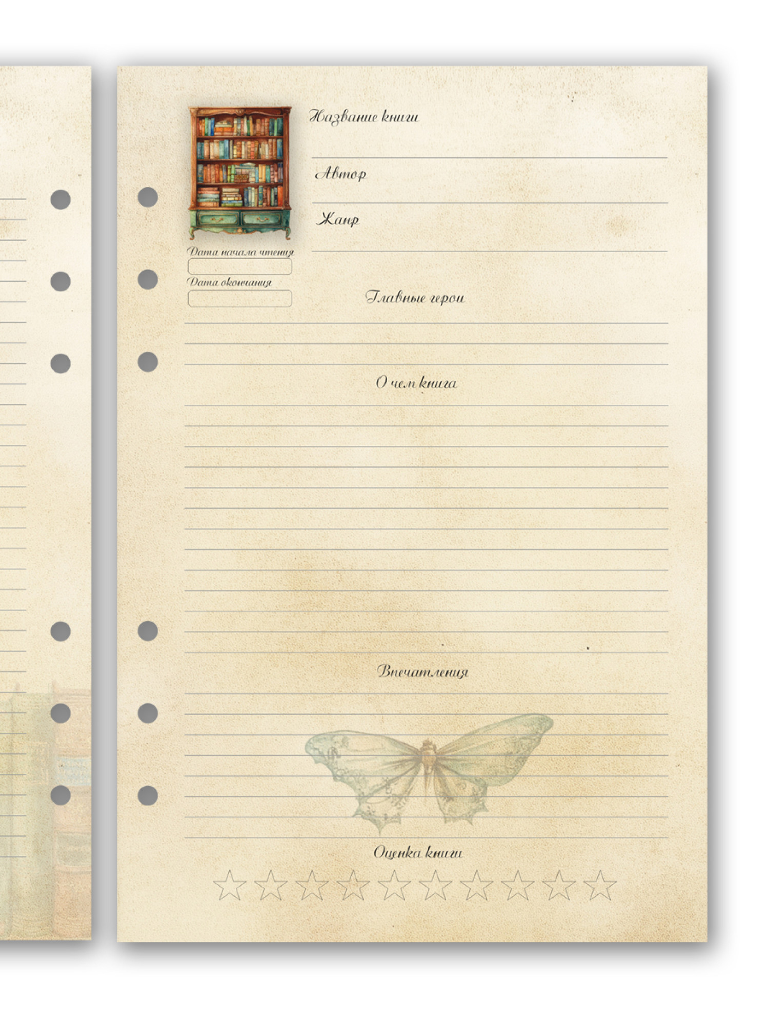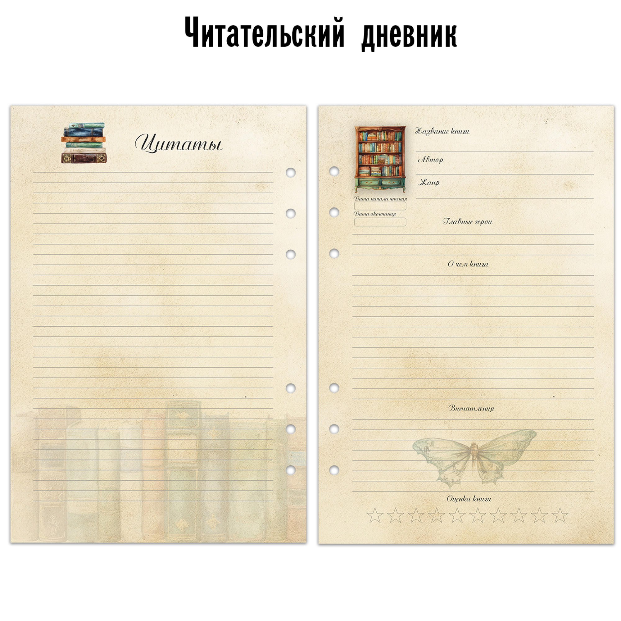 Сменный блок А5 с 6 отверстиями для планера или ежедневника на 6 колец читательский дневник для детей и взрослых в винтажном стиле. Сменный блок состаренной бумаги с красивым атмосферным рисунком поможет вам записать все самое важное в прочитанной книге: название, автор, главные герои, о чем книга или сюжет, понравившиеся цитаты. Читательский дневник для книголюбов и тех, кто практикует осознанное чтение. Создайте свой блокнот для записи прочитанных книг.