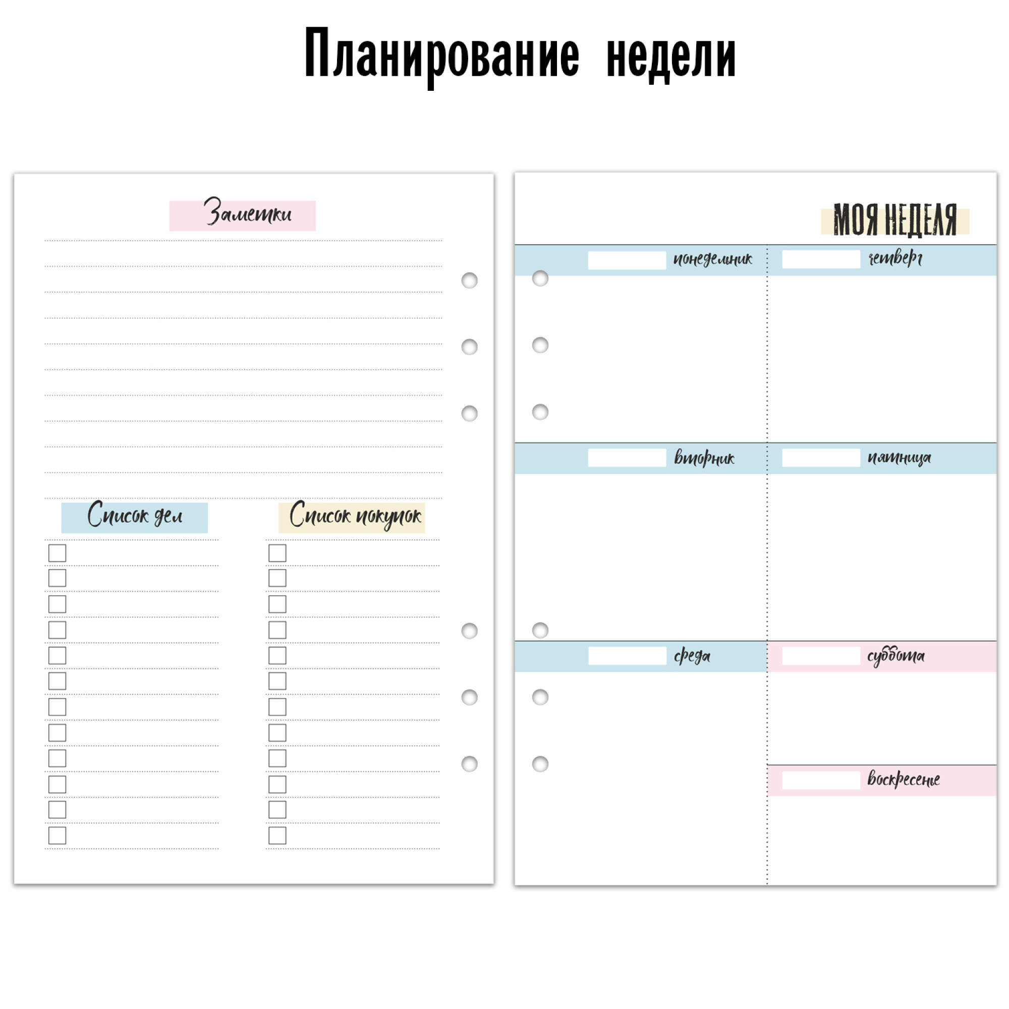 Сменный блок из белой бумаги с 6 отверстиями с цветной печатью для еженедельного планирования.