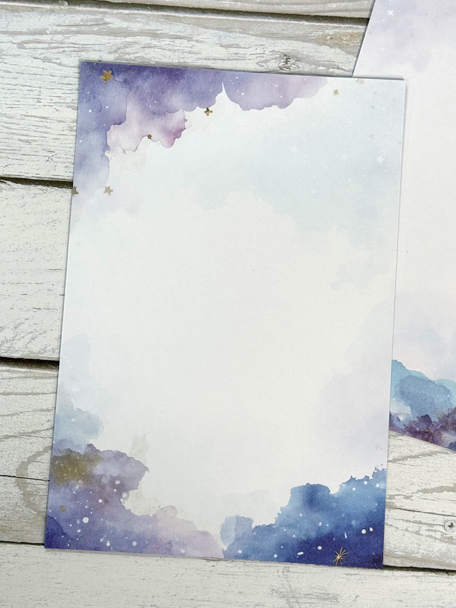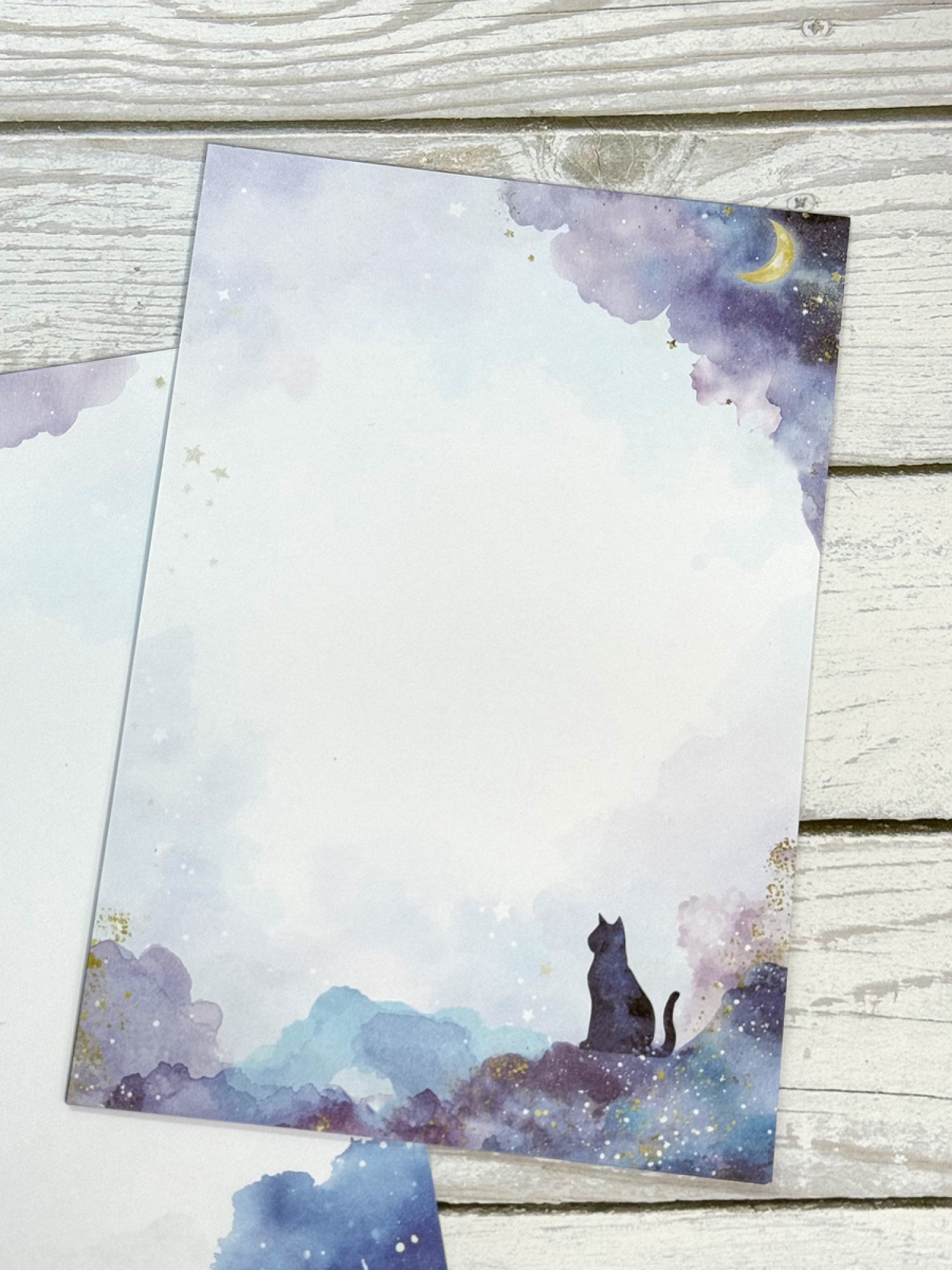Бумага для писем плотностью 80 г/м2 - подойдет для писем, скрапбукинга, творчества, декупажа, оформления фотоальбомов. Красивая бумага для писем с двусторонней печатью и различным рисунком с двух сторон в наборе по 20 листов без линовки. Бумага для письма и рукоделия содержит милый и стильный рисунок кота, смотрящего в на звездное небо и луну. Подойдет для печати на принтере, так как плотность бумаги соответсвует офисной бумаги для печати на принтере. Размер листа А5 формат - 14.2х21 см. Подойдет как письма выпускнику или выпускника, письмо в будущее для капсулы времени, письмо любимому или любимой. Используйте бумагу для писем для ваших проектов как письмо литературному герою или персонажу. Также нашу бумагу для писем вы можете использовать для свадебных приглашений, напечатав текст приглашения самостоятельно на принтере или написав текст от руки.