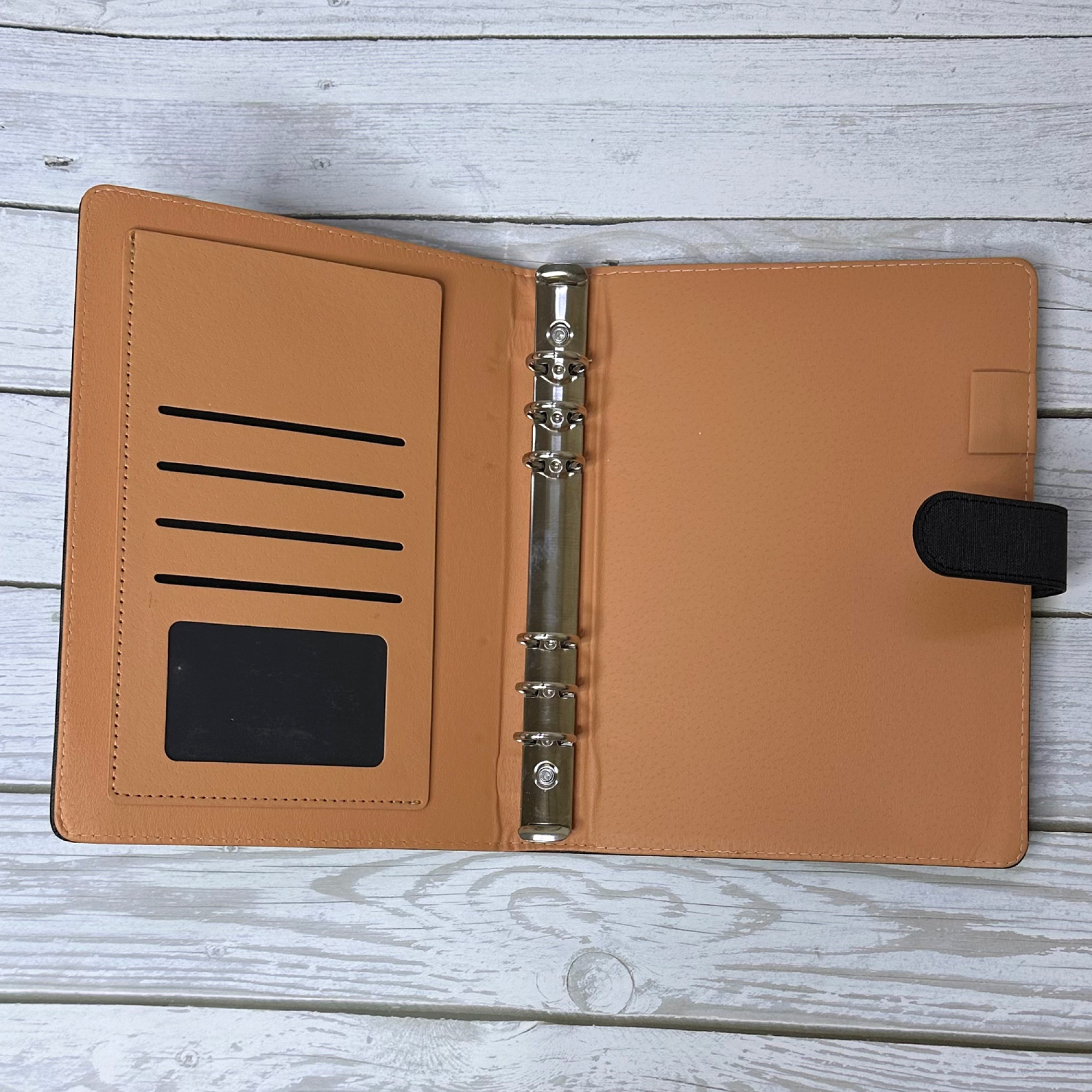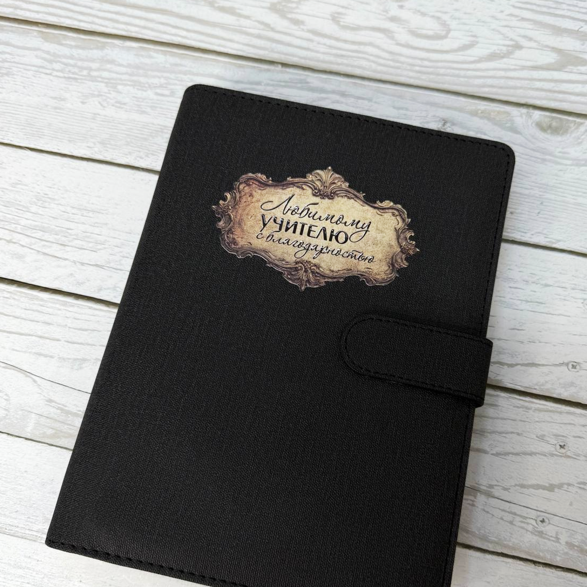 Обложка на 6 кольцах, твердая на магнитной застежке, кожзам, черная с фактурой под лён с надписью "Любимому учителю с благодарностью", А5