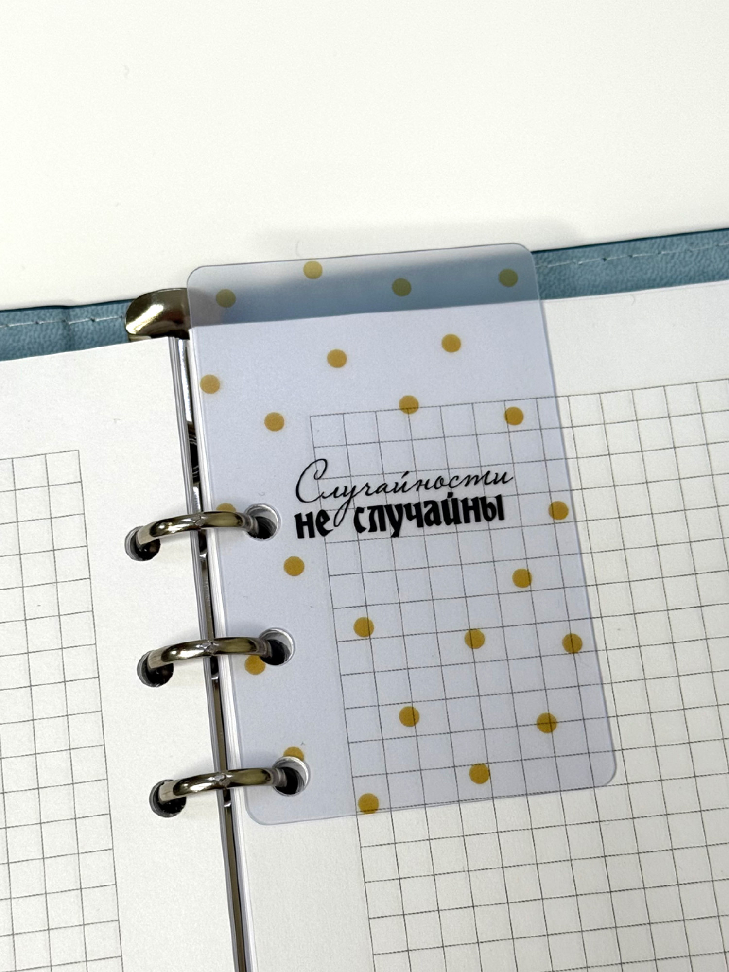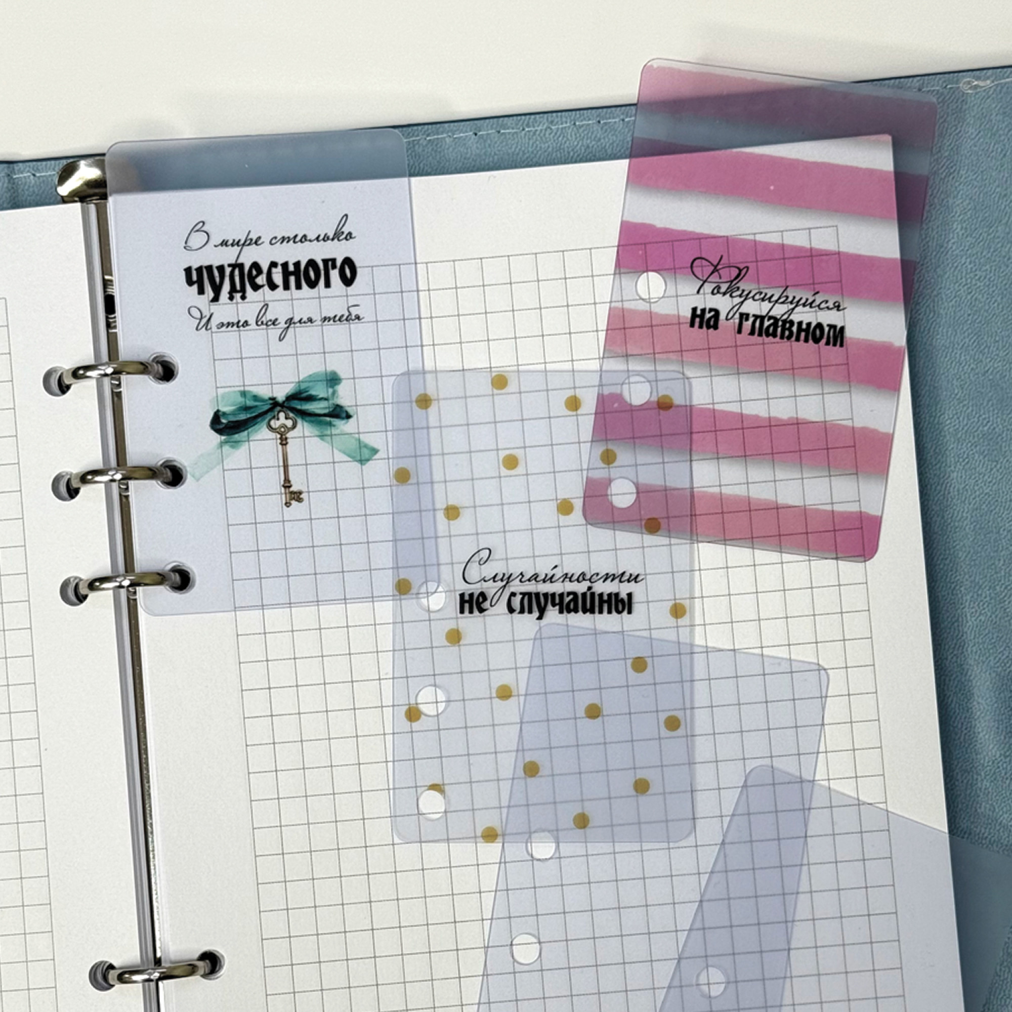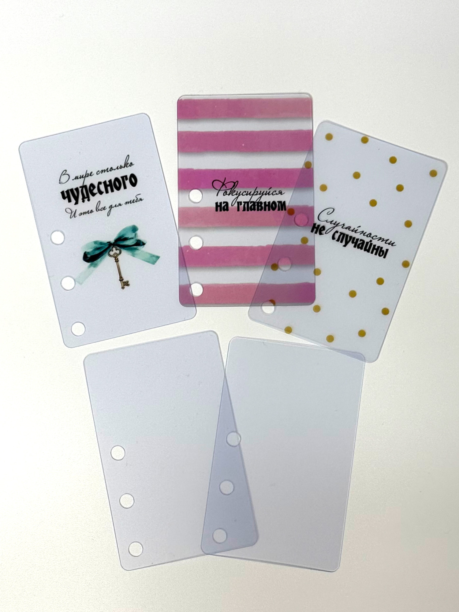 Набор пластиковыех разделителей для формата А5 на 6 колец. В наборе 5 разделителей 5,4 х 8,6 см с закругленными краями. Три разделителя с печатью с красивыми рисунками и надписями и два без печати из прозрачного пластика.
