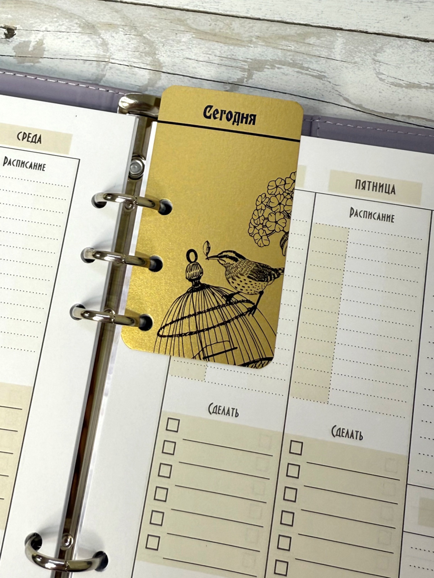 Планер ежедневник для планирование недели на 6 кольцах от бренда Гримуар - это идеальный помощник для тех, кто ценит организованность и эффективность в повседневной жизни. Внутри планера размещено 52 листа формата А5 с планированием недели, 40 листов в линейку, а также мини блок на 6 листов с личной информацией - пароли, важные даты, списки книг и фильмов, колесо баланса. В комплекте также 2 разделителя из золотой дизайнерской бумаги, чтобы легко и быстро находить нужные странички.